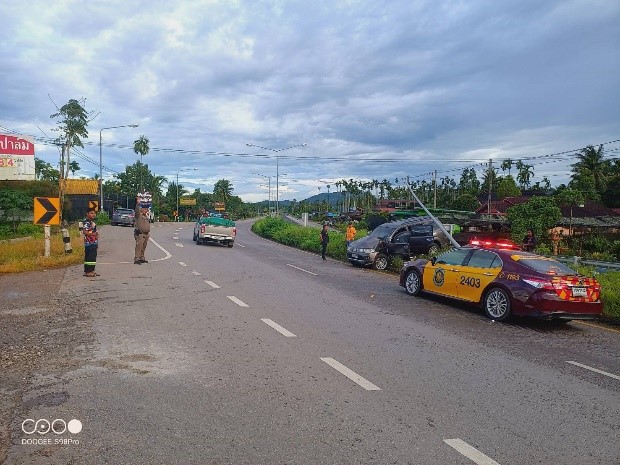 “ตำรวจทางหลวงหลังสวน อำนวยความสะดวก ป้องกันอุบัติเหตุซ้ำซ้อน หลังรถกระบะชนเสาการ์ดเรล”